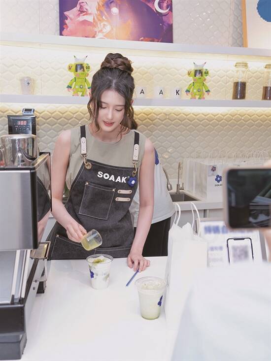 为咗打造新鲜嘅形象,小草特意电咗个蓬松羊毛卷发型,复古得嚟又有轻熟少女味。成为café嘅“一日店长”,朱主爱似模似样咁穿起围裙,无论係冲咖啡定係用抹茶拉花,手势专业一气呵成,睇得出係提前同人“偷过师”。可能係第一日“上岗”,小草偶尔都会大头虾咁唔记得送配套小蛋糕,不过每次递咖啡时,都一定附赠眯眯眼甜炸微笑,同埋暖心寒暄,呢个係小草特别为520准备嘅“限定礼物”。有幸饮到可爱草亲手调制嘅特饮,粉丝们都被甜到“神魂颠倒”。