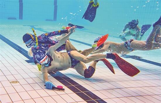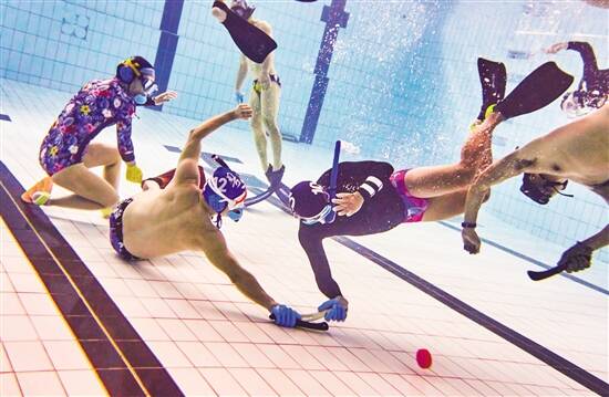 如果话桨板瑜伽係一个人逃离喧嚣,咁水下曲棍球就係一班人潜入水中“找乐子”。水下曲棍球(以下简称“水曲”)源于英国,因冬季寒冷,潜水员无处释放能量,于是就选择喺温暖嘅室内泳池尝试打球。水曲融合咗地上曲棍球同冰球嘅运动规则,通过蹼泳和闭气潜泳实现水下活动。一场水曲比赛需要两支队伍,每支队伍至少要有6人,两队对战,以入球数分出胜负。一场标准比赛时长为33分钟,虽然时间唔长,但水下运动体能消耗大,健身效果冇得弹。
