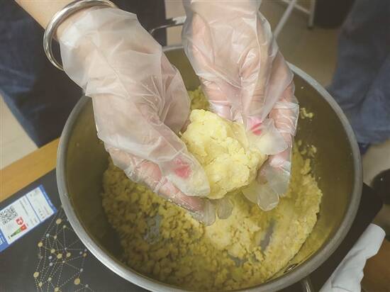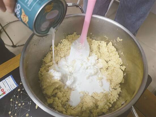 加入黄油并炒干水分,直至成团且不粘手,记得咪炒得过干,否则成品表面容易开裂。