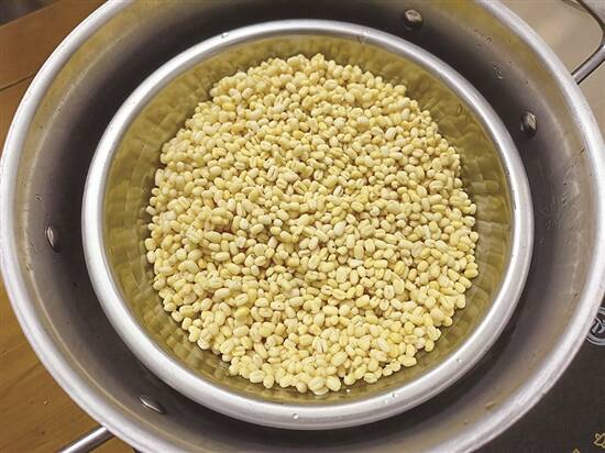 提前一晚浸泡嘅去皮绿豆,隔水蒸制30分钟,直到绿豆变成一捏即碎的状态。