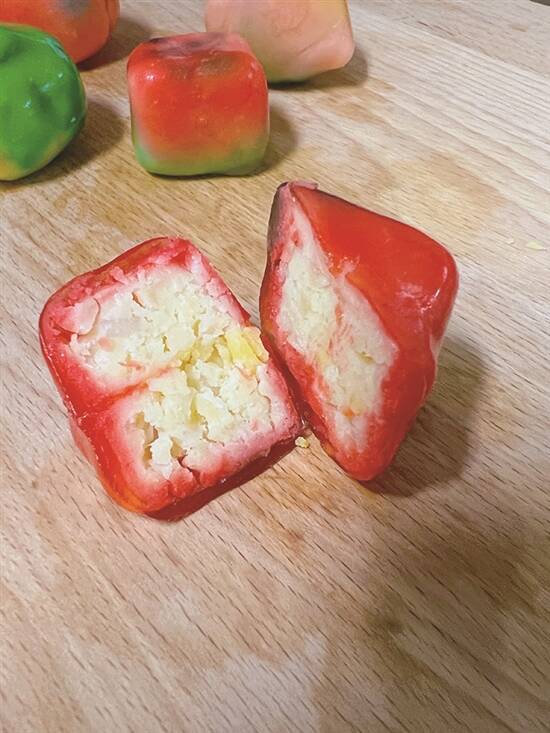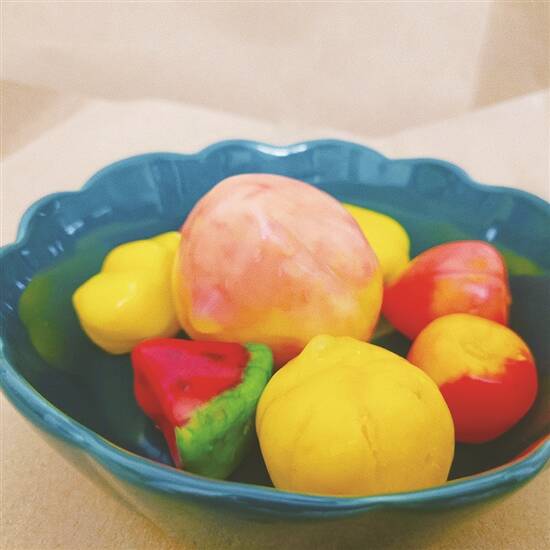 咪睇“露楚”嗰名好神秘咁,其实可以将佢简单理解成啫喱糯皮包裹住嘅椰汁绿豆糕。佢嘅糕体,係用蒸熟嘅去皮绿豆加椰浆、加黄油,炒干水份之后揉捏而成嘅豆沙团。传统露楚一般都係拇指大小的仿真果蔬造型,不过有创意嘅朋友都可以发挥小宇宙,捏成小动物甚至其他小物件都OK。塑型完嘅绿豆泥馅可以用食用色素上色、彩绘,创作空间无穷大噶。露楚外层琼脂口感润滑,搭配上绿豆沙内馅的绵密,风味独特,清爽解腻,非常适合夏天享用。