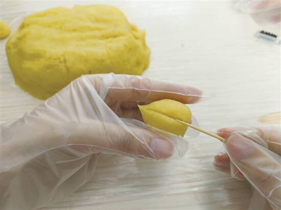 待豆沙团稍微冷却后,就可以分成小份,塑造心仪的造型,用牙签、竹签串好备用。