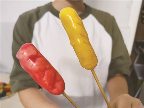 裹咗浆嘅露楚,要插在泡沫板上,让琼脂外衣自然冷却晾干。