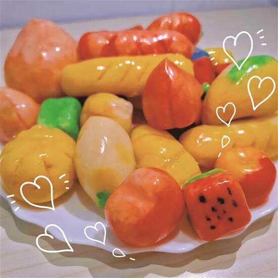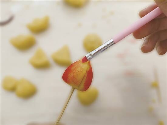 根据造型需要嚟上色,食用色素的色彩效果较好,也可用蔬果汁代替,但颜色略浅。