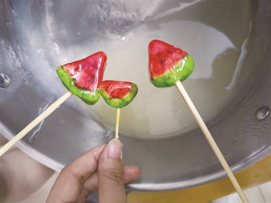 将塑好型嘅内馅完全浸入琼脂液,形成包裹外衣,呢步要按实际情况重复3-4次。