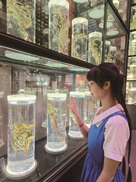 每个进入博物馆嘅观众 ,首先都会被贯通3个楼层的岭南中草药液浸标本墙所吸引,此处展出以岭南中草药为主的600瓶药用植物原色浸制标本,晶莹通透、色彩斑斓,站在馆内不同楼层观赏,会呈现出不一样的视觉美感,被誉为“中药水晶宫”。拣啱角度随手拍,大片靓照即刻get。仲有好多宝藏打卡点散步在各个展馆的角落:可以同巨型人参模型“做friend”,可以走过声控展示柜玩转“隆重登场”,仲有细节满满的中医馆场景区,等你可以挽手铜像合影,或者cos执药大夫……只要你谂得到,就有好多可以影到靓相嘅打卡位。想参观“野生动物世界”?唔一定要去公园,嚟呢度一样可以收获百兽出巢嘅惊喜!馆内特设展区专门介绍药用价值好高嘅海洋生物、陆地动物。例如,海洋馆内有一条“海底隧道”向大家展示鲨鱼、海龟、鲸鱼等等海洋动物标本,海蓝色射灯将通道映衬得非常有feel,企喺中间就犹如置身海底,唔洗湿身都感受到水嘅清凉。