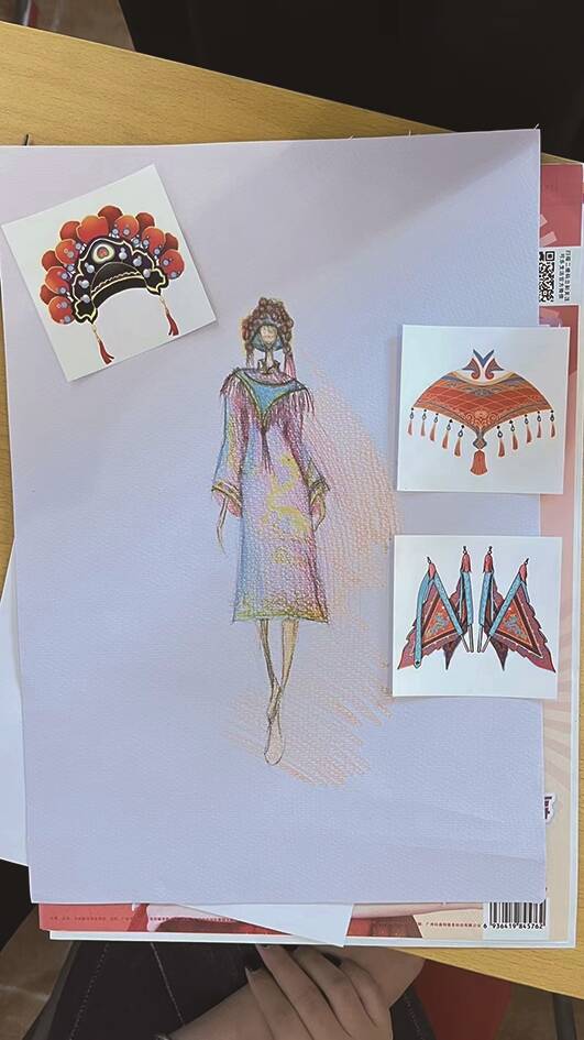 广东女子职业技术学院服装设计专业的黄娟老师,还在学院带来了15位服装设计专业的同学即场PK。大家要在线稿的基础上或者在空白纸上创作,以粤剧融合时装完成一份具有国潮特色的“粤剧猫”时装设计。在她们的奇思妙想同一双巧手下,风格多元化的“粤剧猫”跃然纸上,有国潮风格的,有偏现代时尚风格的,也有经典剧目风格的。最好玩嘅係,Color君发现,同学们还巧妙地将可乐生活报中报道的潮流元素,与主办方提供的粤剧经典服饰贴图相结合,让粤剧和潮流元素你中有我、我中有你,创作出富有岭南广府文化特色又Q萌可爱的“粤剧猫”,每一幅作品都係出圈之作。