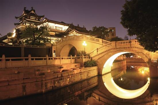 值得一提嘅係,除咗各色商业店铺外,永庆坊内仲分布着粤剧艺术博物馆、李小龙祖居等文化景点,佢哋都係必打卡嘅宝藏玩乐地。其中早前刷爆朋友圈嘅绝美“月亮桥”,就位于广州永庆坊粤剧艺术博物馆附近,其实,呢座石拱桥有一个富含诗意嘅大名叫“叠月桥”。因夜晚亮灯后,桥身结合水中倒影形似月亮,每逢华灯初上,专门来拍摄留影的人络绎不绝。另外,永庆坊内有一部分是“土著”原居民,老广生活气息、传统西关风情与现代潮流文化相交融,形成咗永庆坊独有嘅文化特质。