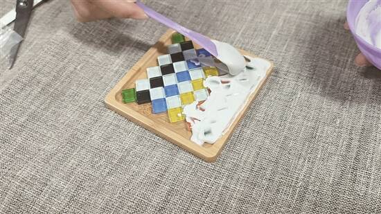 用填缝剂填充拼好的瓷片杯垫,用刮刀刮平表面。成个过程就好似同蛋糕抹奶油咁,十分治愈。