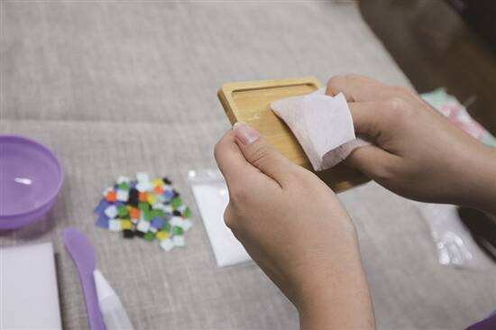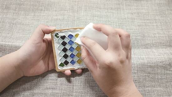 用清洁海绵,擦拭覆盖在瓷片上的多余填缝剂,擦得越干净,杯垫成品效果越好。