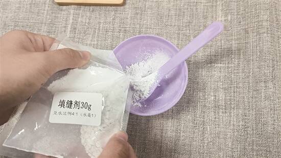 将填缝剂粉末同水按1:4嘅比例,多次少量加水混合,搅拌至牙膏状。填缝剂太稀或者太稠,都会影响最终成品效果。