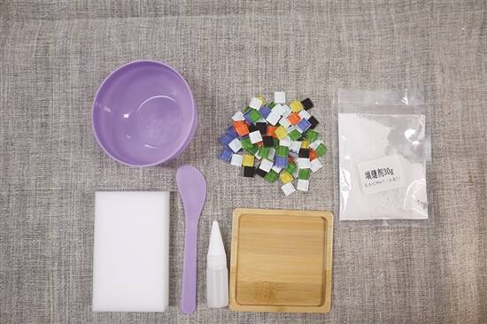 填缝剂、胶水、马赛克瓷片、底盘、清洁海绵。 网购平台上有现成嘅材料包,一键入手成套装备,啱晒容易甩漏嘅小伙伴