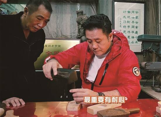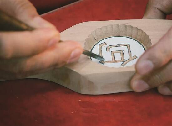 作为广州饼印制作手艺嘅第五代传承人,余师傅因为机缘巧合入行,至今40余年,一直坚持用手工制作饼印。在科技发达嘅今日,尽管机器的速度更快、更便捷,但余师傅觉得,通过人手篆刻嘅花纹,会更加生动、更加有温度。每个饼印的制作,都要经过十几道工序先可以完成,每步都唔可以马虎,制作者唔单止要有耐性,仲要够细心。麦包喺师傅嘅指导下,都费咗好多精力先完成咗一个“包”字饼印,佢感慨道:“只眼差啲都唔得啊!”饼印除咗可以刻文字,仲可以雕刻多种多样、寓意美好嘅纹样,好似鲤鱼图案,取其谐音“余”,寓意“年年有余”。种种美好祝福,原来都被刻进木头里,印到礼饼上,随着嗰份美味传播出去。