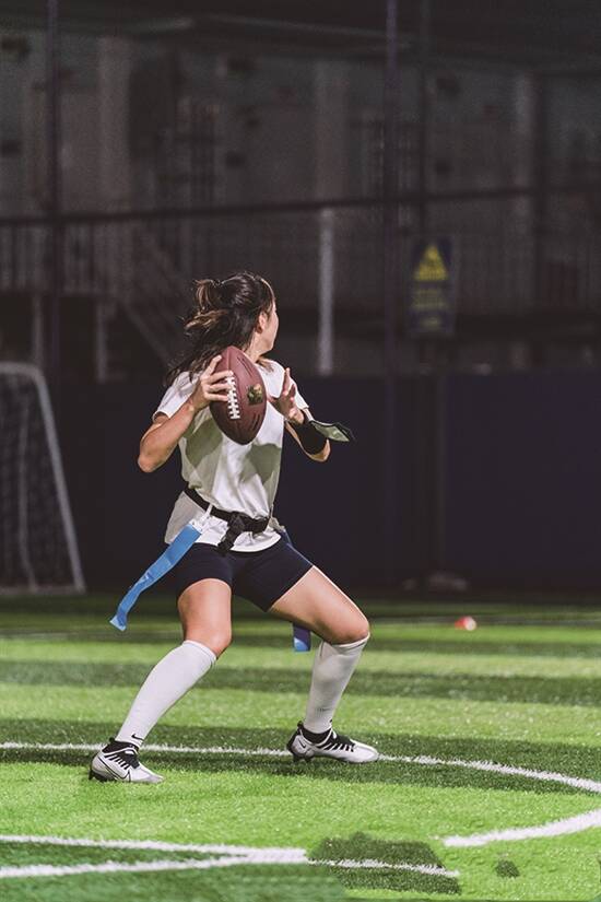 观赏性高、身体碰撞又激烈嘅美式橄榄球,对参与员身体素质要求好高,既要有力量又要有速度。因为竞技要求,运动过程中冲撞环节非常多,能真正参与到这项运动中嘅人少之又少,运动员多数以伤病结束运动生涯。为咗令参与者更安全、便于大众化推广,美式橄榄球嘅“简化版”——腰旗橄榄球就诞生啦!同传统的美式橄榄球相比,腰旗橄榄球的游戏规则最大不同就是,不允许抱人、推人,是一项非冲撞类的运动,而且,对玩家嘅身高、性别、年龄 以及强壮程度都没有特别要求,甚至可以男女混搭一起玩。虽然腰旗橄榄球赛制简单了、“温和”了,参与门槛降低了,但一样好考验个人的应变能力、体能素养,以及团队协作的能力。热血又有趣嘅团队运动,真系好适合一班老友记约埋一齐玩。