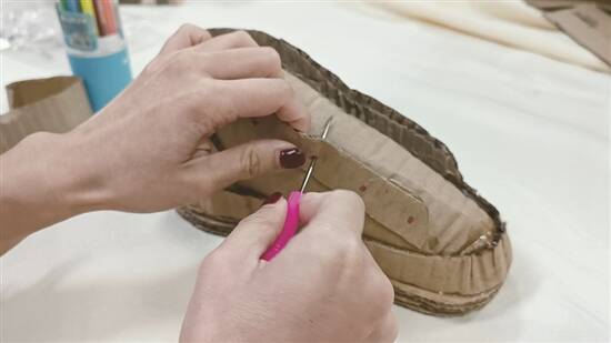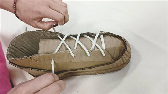 穿好鞋带后,再调整好鞋舌,纸皮波鞋嘅雏形就OK啦。贪靓嘅朋友仔,也可以继续用颜料、丝带等材料,继续美化波鞋嘅细节。