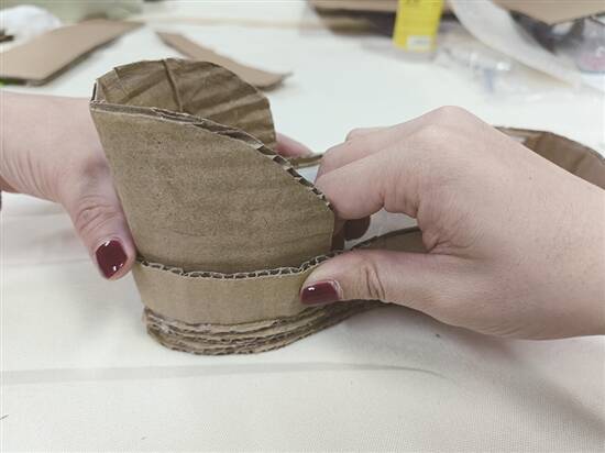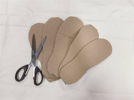 在纸箱上剪出鞋底形状,可以备多几份“鞋底”增加厚度,裁剪完就用胶水将佢哋对齐黐实。然后,再稍微修剪边缘,令鞋底线条更整齐流畅。