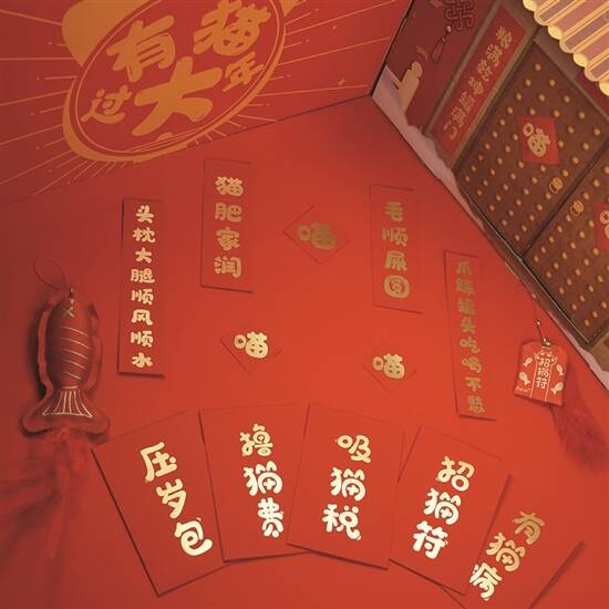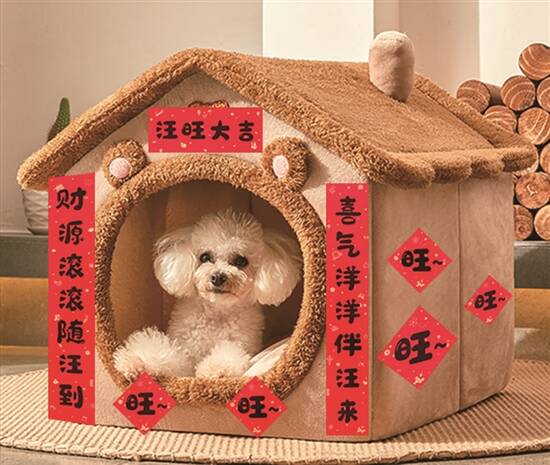 辞旧迎新嘅仪式感,当然少不了贴福字、挂春联!大家换好晒自己屋企大门、房门嘅“红纸仔”之后,不妨帮“小可爱”嘅安乐窝都贴翻一副“猫肥家润”对联啦。专门for宠物窝嘅对联,比我哋日常贴门口嘅size细好多,仲会根据唔同嘅宠物设计专属内容:汪汪大吉、喵宅妙哉、兔飞猛进等等,大玩谐音梗,寄予好意头。如果觉得贴嚟贴去都唔啱心水,都有直接一体成型嘅新春风猫抓板,用瓦楞纸做成,可以比小动物练下爪,有啲产品整体造型好似间屋仔咁,爱宠玩到瞓觉都唔惊冷亲,外观已经print好晒金黄、鲜红嘅过年色,以及各种福气字句,就算爱宠唔玩,放喺屋企都已经係一个喜庆摆件啦。