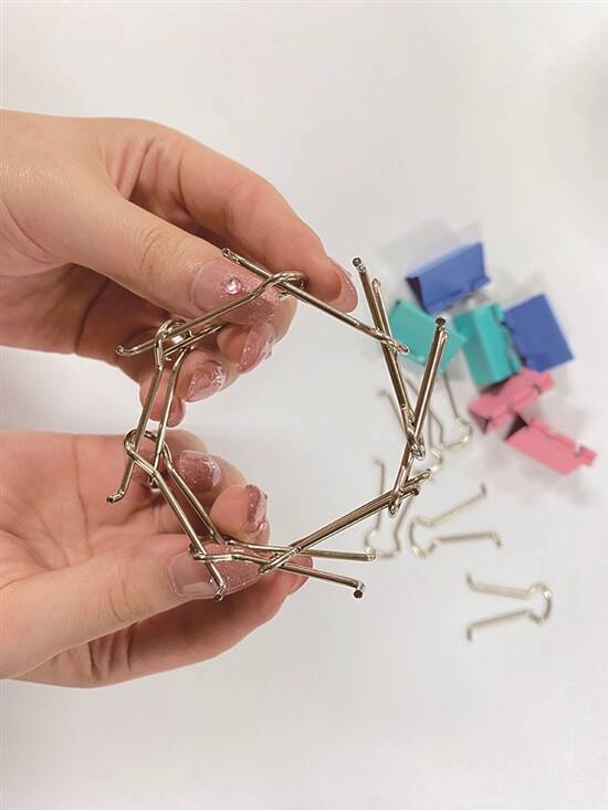 一盒长尾夹内配色多样,有粉色、蓝色、绿色、黄色等。大家可以选择自己中意嘅颜色,搭配制作装饰品。长尾夹亦有唔同size,市面上更常用的是41mm、32mm、25mm。如果用单一颜色制作艺术品,就会精致有个性一啲,如果用上各种颜色缤纷搭配,就可以显得更有创意!大size拼出嘅成品造型更加显眼,不过就唔易操控,要花多啲心思。另外,夹仔多数为钢制,由弹簧片夹体同埋两个较长的尾柄弹簧钢丝卡构成。因为钢制边缘锋利,大家整嘅时候就要特别小心,记得唔好用蛮力,一唔小心就会刮亲自己噶。