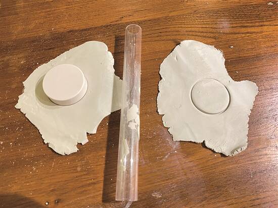 3 亚克力管压平两团球,再用瓶盖按出两个同等大小的圆饼。