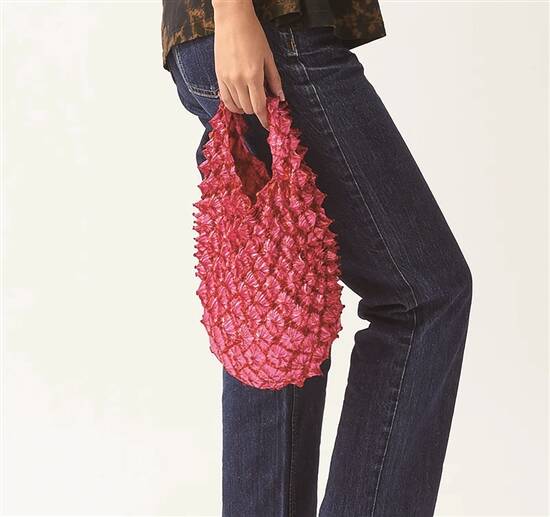 榴莲除咗气味霸道之外,外形都係非常“生人勿进”的,密密麻麻嘅芒刺就是佢对自己嘅保护。有泰国当地人心灵手巧咁整咗个仿真榴莲斜挎包,外形100%还原榴莲个look,里面有肥美饱满嘅“果肉”,逼真到忍唔住想咬一啖。亦有啲品牌巧妙咁将呢啲拮手刺刺“软化”,用泡泡布模仿榴莲嘅芒刺做成手袋,“泡泡刺”可以伸缩,袋身可以根据所装物品嘅size增大缩小,非常人性化。最特别嘅係佢模仿埋经典嘅榴莲配色,望落就好似揸住一个榴莲壳咁,分分钟变防身神器。除咗呢啲榴莲造型嘅包包,有啲扁身手包都会设计带有榴莲刺元素,整齐排列嘅凹凸刺身,令成个包包嘅质感都升华唔少。