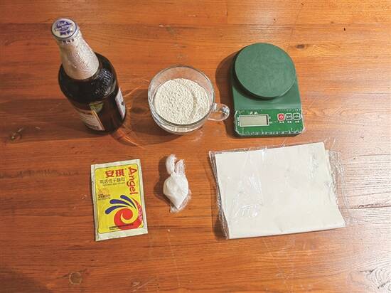 1.准备面粉200g、啤酒175g、食用盐3g、干酵母6g,将食材全部混合搅匀。