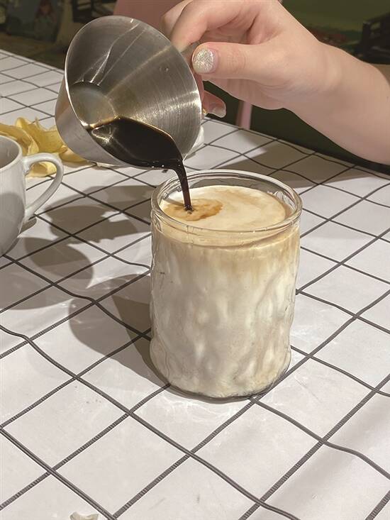 3、制作一份浓缩咖啡,慢慢将咖啡液倒入杯中,一杯秋意拿铁就完成啦!
