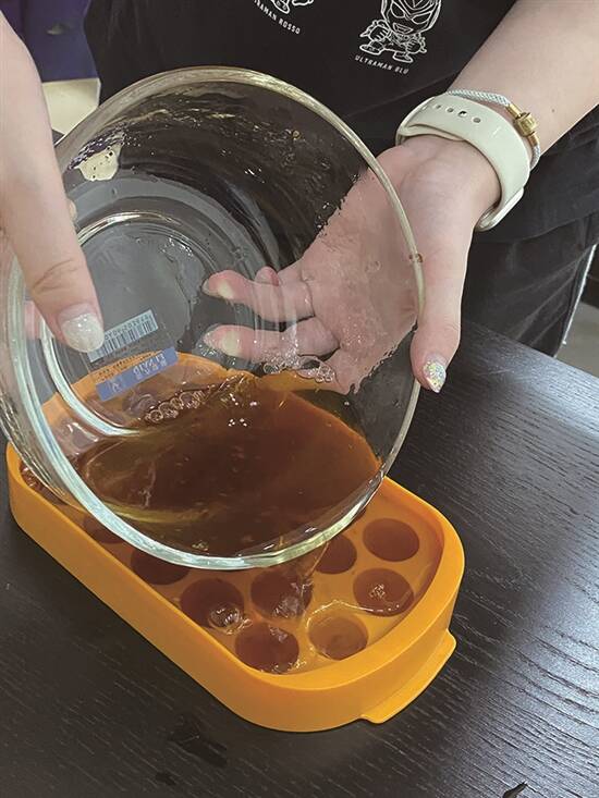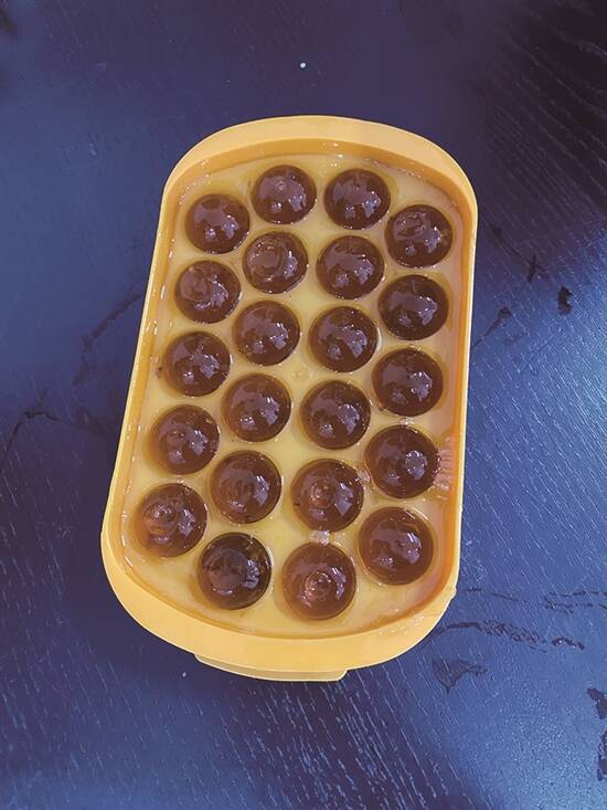2、煲中加入水和茉莉茶包,煮出茶色后,倒入桂花蜜。煮至沸腾后,立即倒入25克白凉粉搅拌均匀,倒入球型模具静置3小时,出来嘅就係上层嘅桂花果冻。