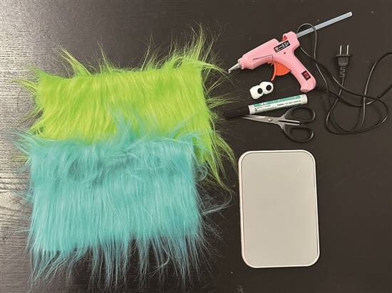 材料:镜子、长毛布料、热熔胶、尺子、记号笔、剪刀、饰品