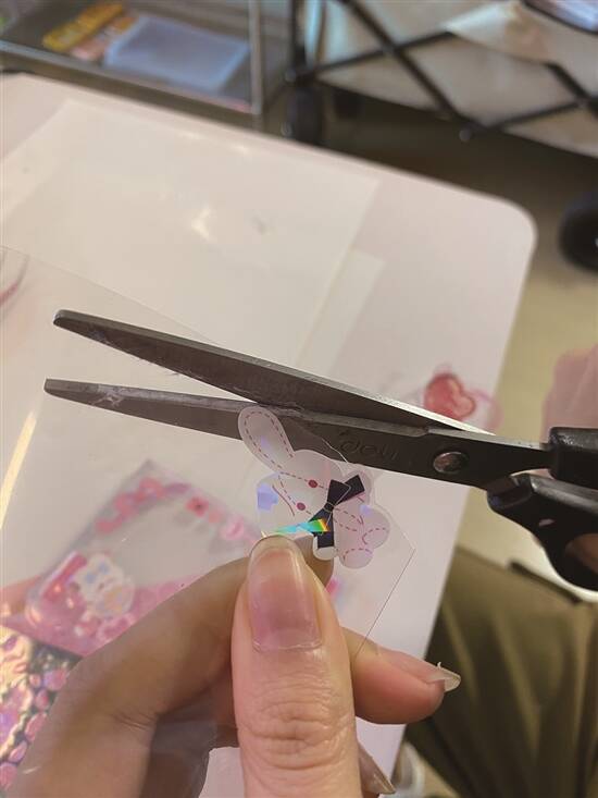 2.将需要做出立体效果的贴纸贴放在pvc片上,用剪刀沿着轮廓裁剪下来。