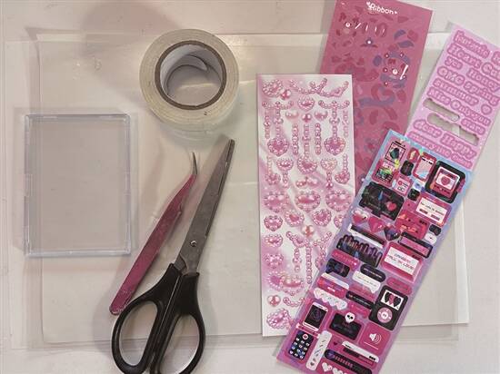 材料准备:镊子、剪刀、纳米胶、小垫板、PVC片、若干贴纸装饰
