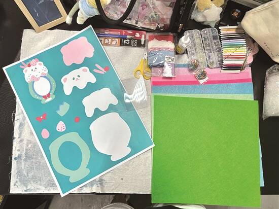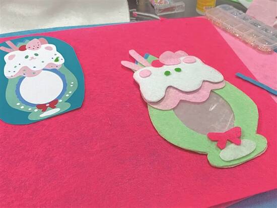 1. 材料:冰沙图纸、不同颜色的不织布若干、装饰小物件若干、透明卡套、珠链。
