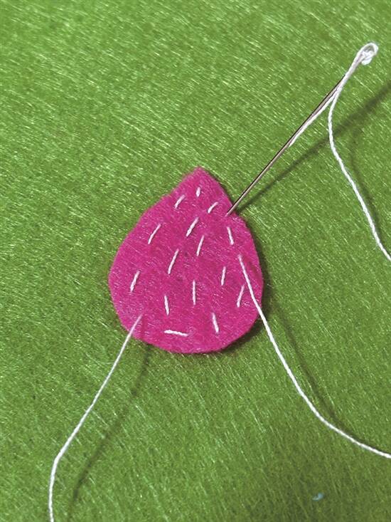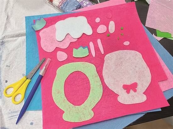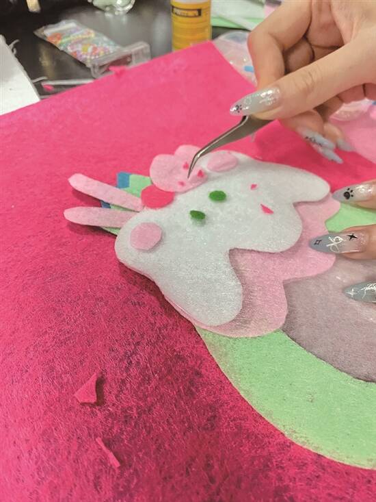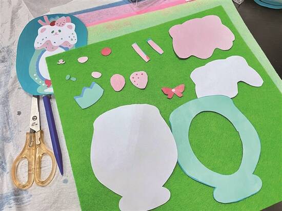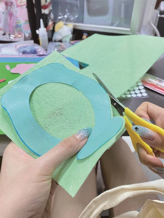 3.将裁下的图纸黏在相应颜色的不织布上,沿着图纸边缘裁剪对应图案。