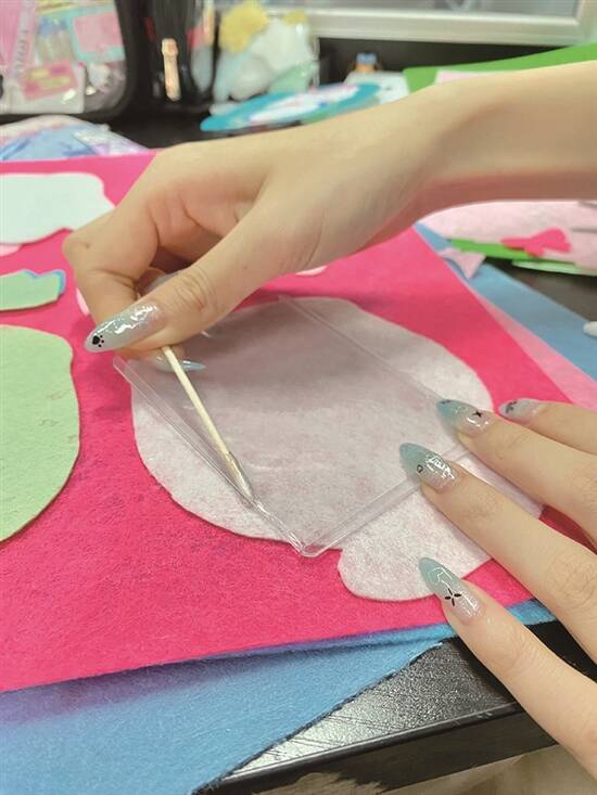 4.在用作底色的不织布上,找适合的位置,用胶水黏上卡套,藏好卡套的边缘,再按照样品图纸一层层叠加布料。