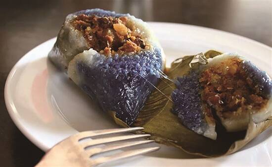 由蝶豆花汁染色变成梦幻嘅淡蓝,颜值十分出挑。娘惹粽嘅内馅由肉、芫荽籽同白胡椒粒混搭制作而成,因此口感甜中带辣。喺端午前后,当地超市、专门售卖粽子嘅店铺会售卖。