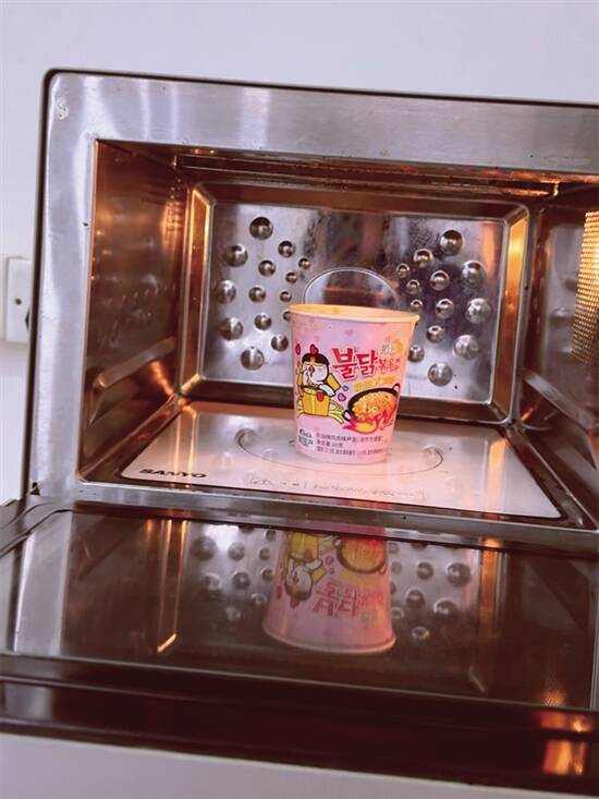 3、倒入酱料,铺上芝士片,加入适量滚水冲泡3分钟。