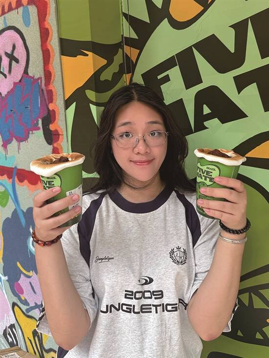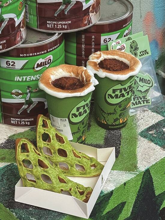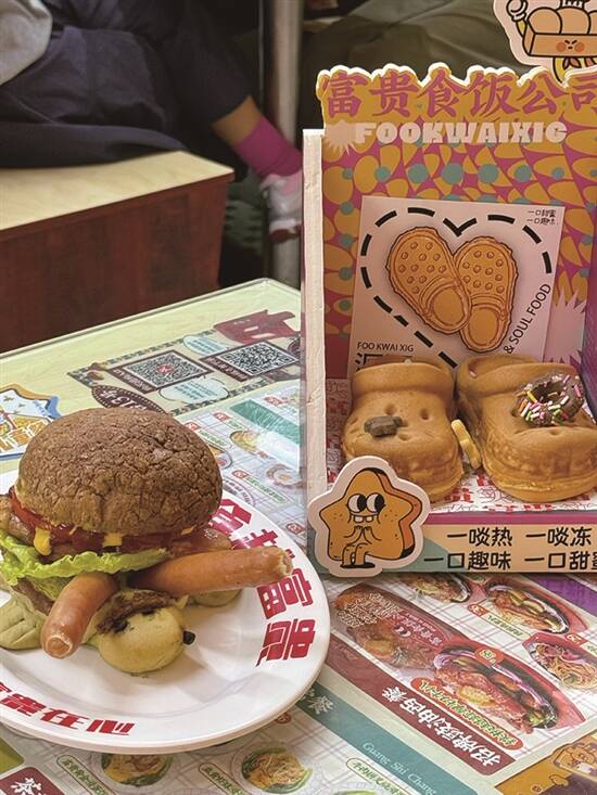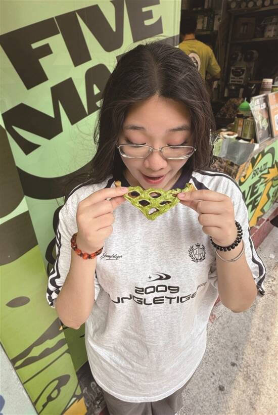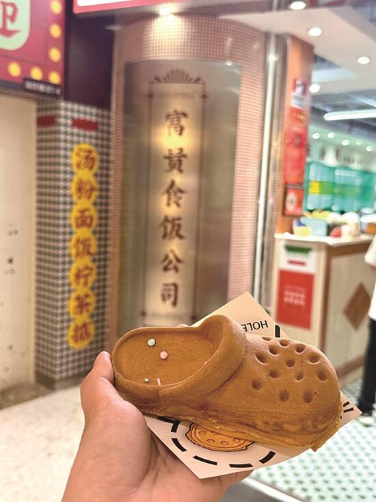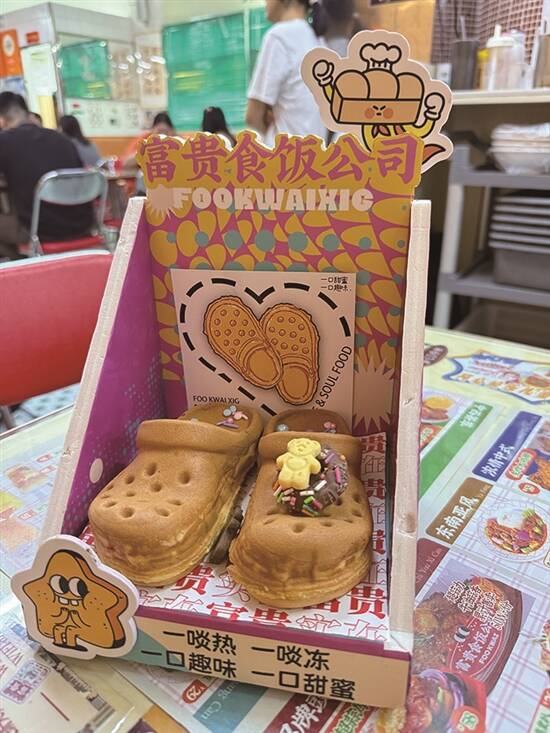 眨眼间,夏日就杀到啦!学生哥仔放假,梗係要开启“逛吃逛吃”模式啦。可乐君最近发现,商家们为咗捉住“为食猫”嘅胃,真係绞尽脑汁,各出奇招!快啲跟住我睇下呢啲新奇到爆嘅美食,你最想试边一种呢? 饶禧/文 饶禧、黄译萱/图 黄译萱/模特 华夫饼可晾晒 想食潮流新鲜嘢,点少得“潮到风湿”嘅东山口!最近火到爆嘅“FIVEMATE”奶茶店好易认,无论店嘅装修定係出品,全部都係绿色系嘅,让人一秒穿越东南亚。店内最受欢迎嘅“斑斓竹篮华夫饼”,竹篮造型加上清新嘅斑斓绿,靓到唔舍得食!食客们仲脑洞大开,用竹竿当衣架,将华夫饼挂起身影相,氛围感拉满!睇落清新嘅华夫饼,食落有斑斓清香和华夫饼嘅酥脆,最后融入表面撒上的糖霜,风味独特,口感丰富!饮品都超有心思,搭配同色系嘅“恐龙熔岩杯”马黛茶,上层香蕉味棉花糖加入milo粉,可可味的茶香唔会太苦,双重口味“夹击”,饮起身顺滑到好似“德芙巧克力”,正到冇朋友! “窿窿鞋”香喷喷 广东人有多爱“窿窿鞋”(即洞洞鞋)?落雨、出街、上班,一对洞洞鞋全程通用!但你绝对估唔到,我哋老广竟然连“洞洞鞋”都食落肚!喺广州潮流圣地之一嘅江南西,有间“富贵食饭公司”,将洞洞鞋同鸡蛋仔玩Crossover!大家用12蚊就可以食到24码嘅“拖鞋鸡蛋仔”,造型逼真,仲帮你配埋可爱“鞋花”,一睇就想“咔嚓”影相发朋友圈。店家用香浓蛋浆现烤,只要等四分钟,热辣辣、香喷喷嘅“窿窿鞋”就新鲜出炉!趁热咬一啖,成个鼻腔都係蛋香味。拣芝士味嘅话,每一啖都有会有拉丝效果。唔单止咁,店家仲会推出“火箭龟龟包”,绿色嘅龟仔面包夹住两条肠仔,表情呆萌到爆,得意到令人唔舍得食。呢个包三层超有料,上层係脆皮菠萝包,中间有鸡扒同肠仔,底层面包松软,“碳水炸弹”入口饱肚兼满足。食完“窿窿鞋”又食“龟包”,啱晒颜值控心水。 龟苓膏坚有龟 喺广东美食界,一直流传住“老婆饼冇老婆,煲仔饭冇细路仔”嘅搞怪说法,但龟苓膏里面,真係有龟!去到天河甜品老店“韵姐甜品”,一定要食一碗清热解毒嘅龟苓膏。呢度嘅龟苓膏,除咗用真材实料龟壳熬制,上面仲放咗只Q弹到爆嘅“乌龟”!轻轻拮一下,龟仔就“Duang Duang”震,可爱到犯规!龟苓膏本身係下火良药,配上秘制顺滑炼奶,初初食落去有啲苦,伴有淡淡草药香,但食多两啖,口感爽滑细腻再加上回甘滋味,最啱夏日清凉解暑。