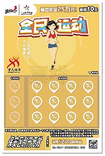 “全民运动”一套五张,单票面值10元,共有12次中奖机会,头奖25万元。五个票面分别为健身、跑步、骑行、羽毛球和足球,都是深受大众喜爱、普及率高的运动,通过卡通形象的展示,传达阳光、活泼、正能量的信息。通过票面主形象中运动健身的漫画人物表现“全民健身”主题,风格轻松愉悦。主色调采用清新、活泼的颜色,使整个票面更清新、时尚。“全民运动”游戏规则为:刮开覆盖膜,如果你的号码中任意一个号码与中奖号码之一相同,即中得该号码下方所示的金额;如果出现“顶呱刮”标志,即中得该标志下方所示金额的两倍。中奖奖金兼中兼得。