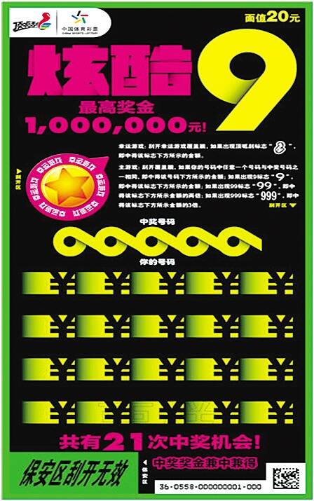 这是一款极具个性的数字主题即开票,炫酷主题名称体现了整体票面风格,票面采用荧光墨印制,从票面设计到奖级设置,都以“9”为主题,并与2019年相呼应,具有极强的产品感染力和视觉冲击力。该票单张面值20元,有21次中奖机会,最高奖金达100万元。游戏规则为:幸运游戏:刮开幸运游戏覆盖膜,如果出现“顶呱刮”标志,即中得该标志下方所示的金额。主游戏:刮开覆盖膜,如果你的号码中任意一个号码与中奖号码之一相同,即中得该号码下方所示的金额;如果出现“9”标志,即中得该标志下方所示的金额;如果出现“99”标志,即中得该标志下方所示金额的两倍;如果出现“999”标志,即中得该标志下方所示金额的3倍。中奖奖金兼中兼得。