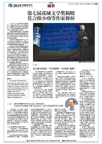 莫言的女儿管笑笑专程提前从国外赶回来,代替父亲上台领奖,并在现场播放了莫言的一份视频版获奖感言,在视频中莫言说道:“《花城》是一份非常好的刊物,有四十年光辉的历史,发表了诸多优秀的作品,培养了许多优秀的作家。我作为一个《花城》的老作者,希望这份刊物继续成长,继续为繁荣我们的文学事业做出更大的贡献。我在南美洲南部的一棵大杜鹃下发表这样一个简单的演讲,祝福《花城》像这棵花一样繁荣昌盛,繁花似锦。”