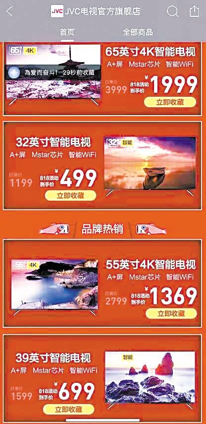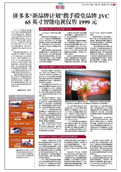 ■“新品牌计划”联合JVC研发的首批定制化大屏电视,于8月18日零时正式登陆拼多多,其中65英寸4K智能大屏电视,售价仅1999元。