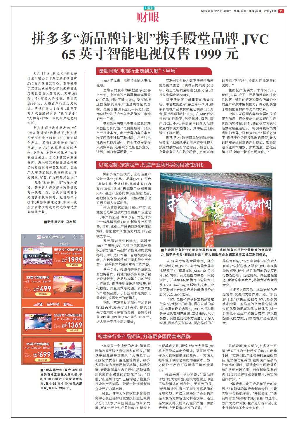 拼多多“新品牌计划”携手殿堂品牌JVC 65英寸智能电视仅售1999元
