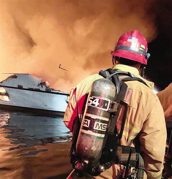 ■9月2日,在美国加利福尼亚州南部圣克鲁斯岛附近,消防员扑救游船大火。新华社发