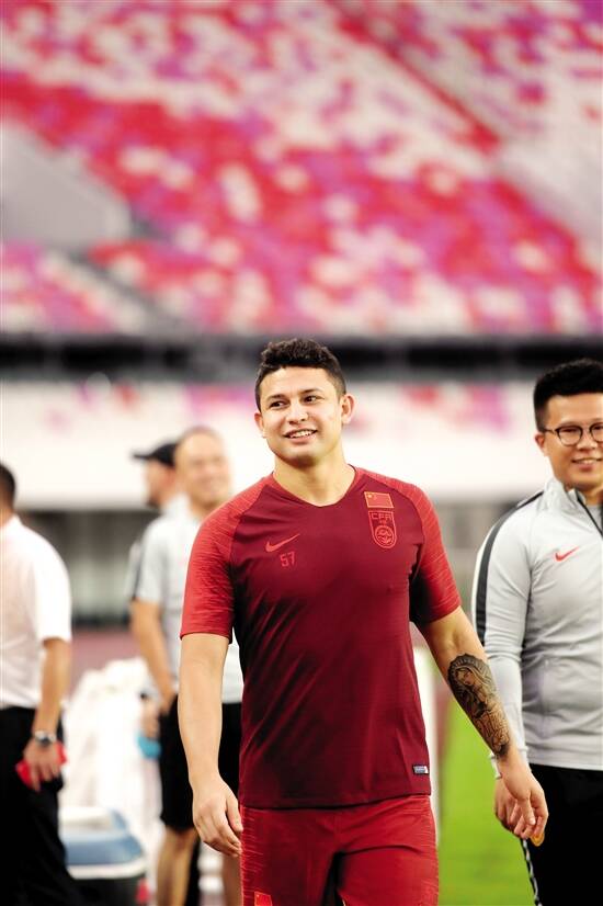 ■国足集训,归化球员艾克森成为焦点。新快报记者 孙毅 实习生 石娟/摄
