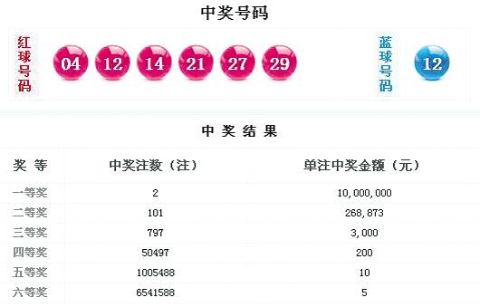新快报讯 记者陆妍思报道 9月3日,双色球第19103期开奖全国中出2注1000万元头奖。开奖后奖池回升至7.26亿多元。双色球第19103期的开奖号码为:红球“04、12、14、21、27、29”;蓝球“12”。红球号码大小比为3:3,三区比为1:3:2;奇偶比为3:3。其中“12”为上期重号,“04”“21”为前期隔码,同时开出一组同尾号“04、14”。