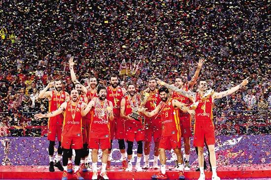 新快报讯 昨晚,虽然阿根廷队比赛最后时刻发起激烈冲锋,但沉稳的西班牙队依靠高度和默契化解了对手的挑战,最终以95∶75取胜。这也是2006年后,西班牙队第二次登顶篮球世界杯最高奖台。这场比赛之前,外界认为阿根廷队活力多变的打法会给对手很大压力。而比赛开始后,西班牙队在依靠高度优势掌控比赛主动。全场比赛,西班牙队抢下47个篮板球,而阿根廷队才27个。第一节比赛,西班牙队就以23∶14领先,到第三节结束时已经以66∶47遥遥领先。虽然阿根廷队一直没有放弃,通过全场紧逼将分差缩小。然而西班牙队并没有慌乱,在卢比奥的率领下,稳稳地将优势保留到最后。西班牙男篮有多达8人超过30岁,小加索尔和鲁迪·费尔南德斯都已经34岁,尤伊和克拉沃也已经31岁。昨晚属于这些老将。