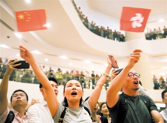 ■24日,香港太古广场大堂内。数百名香港市民自发聚集在这里,参加“高唱国歌”快闪活动,表达对家国的浓浓深情和对香港恢复稳定的美好期待,共庆新中国成立70周年。新华社发