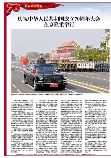 壮阔七十载,奋进新时代。10月1日上午,庆祝中华人民共和国成立70周年大会在北京天安门广场隆重举行,20余万军民以盛大的阅兵仪式和群众游行欢庆共和国70华诞。中共中央总书记、国家主席、中央军委主席习近平发表重要讲话并检阅受阅部队。中共中央政治局常委、国务院总理李克强主持庆祝大会。中共中央政治局常委、全国人大常委会委员长栗战书,中共中央政治局常委、全国政协主席汪洋,中共中央政治局常委、中央书记处书记王沪宁,中共中央政治局常委、中央纪律检查委员会书记赵乐际,中共中央政治局常委、国务院副总理韩正,国家副主席王岐山出席。