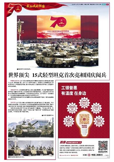 两栖突击车方队:这个方队由海军陆战队所属部队抽组而成,海军陆战队组建于1980年,具有陆地、海上、空中、水下多种作战能力。受阅的05A式两栖突击车,具有灵活的水上和陆地机动性能、强大的突击能力、优越的综合防护能力,是登陆作战的主战装备。轻型装甲方队:水田路网如履平地,丘陵山地纵横驰骋。作为国产最新型陆军装甲突击力量的优秀代表,15式轻型坦克首次亮相国庆阅兵。为适应南方水网、高原山区等地形的作战部署要求,15式轻型坦克应运而生。由于采用了一系列新技术,15式轻型坦克整体作战能力跻身当今世界顶尖水平。