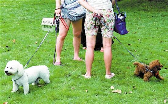 ■狗狗们在二沙岛的草坪上秀萌。 宁彪/摄(资料图片)