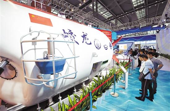 一入展馆,“蛟龙号”载人潜水器率先抓住了众人目光,观众们纷纷驻足与这个“大家伙”合影留念。据悉,“蛟龙号”由我国自主研发,2012年6月在马里亚纳海沟创造了下潜7062米的中国载人深潜纪录,这也是世界同类作业型潜水器最大下潜深度纪录,可谓是“中国制造”的海中深潜霸王。